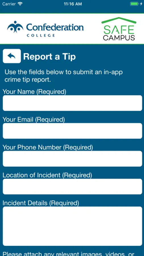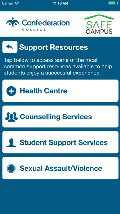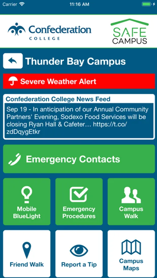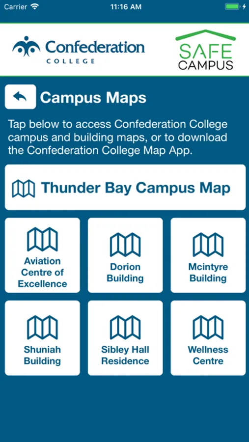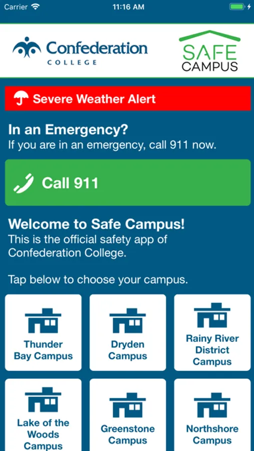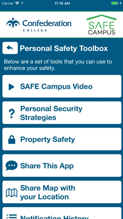 Safe Campus is the official safety app of Confederation College. It is the only app that integrates with Confederation College's safety and security systems. Public Safety and Risk Management has worked to develop a unique app that provides students, faculty and staff with added safety on the Confederation College campus. The app will send you important safety alerts and provide instant access to campus safety resources.