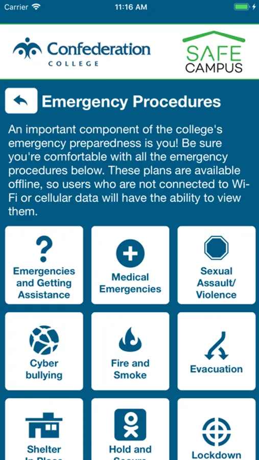 - Emergency Procedures: Campus emergency documentation that can prepare you for disasters or emergencies. This can be accessed even when users aren’t connected to Wi-Fi or cellular data.