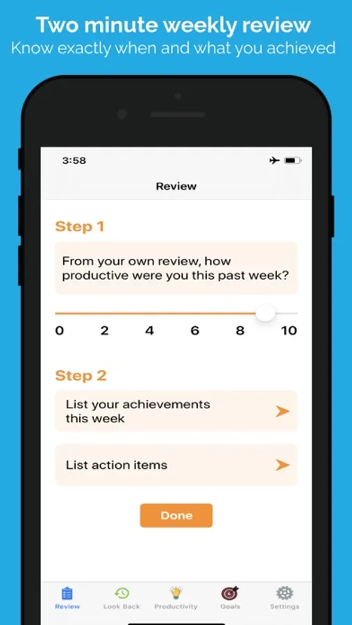 2 Minute Weekly Review: Look back at your week, and note your achievements, action items and how productive you feel closing out the week