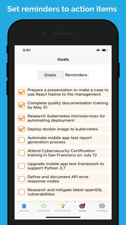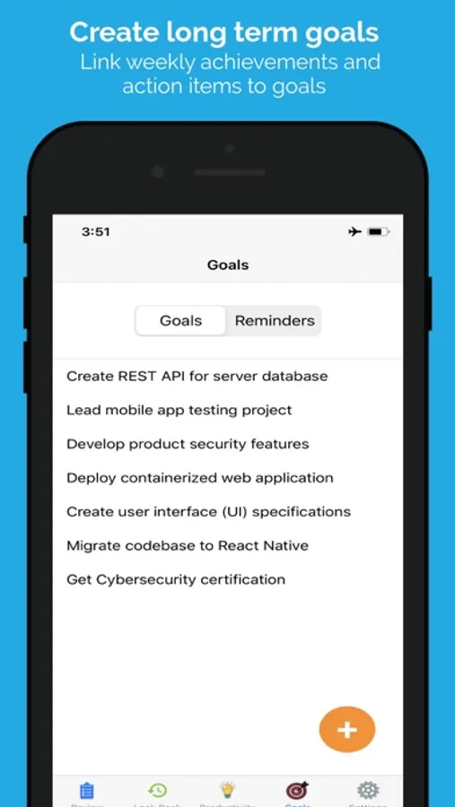 Create long term goals and link achievements and action items from weekly review to these goals. Set reminders to close out goal specific actions.