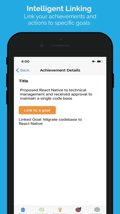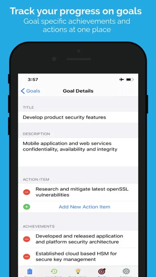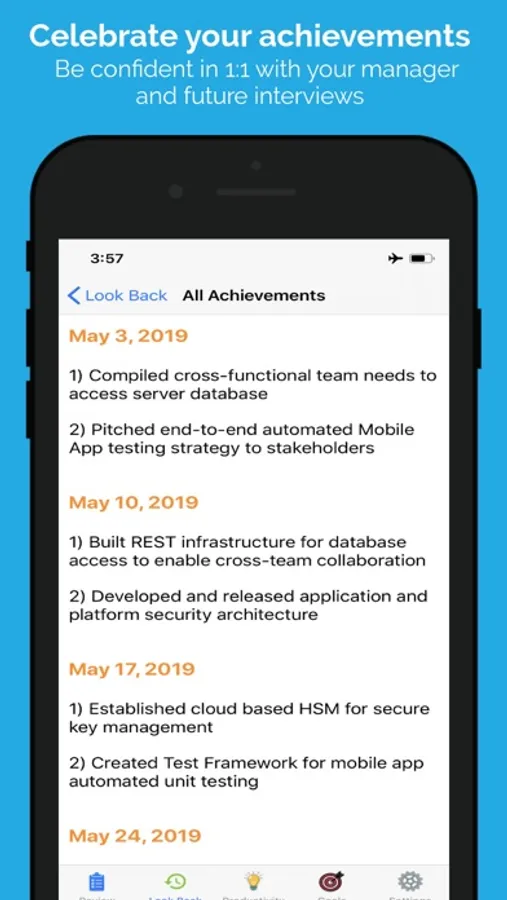 Create long term goals, set reminders and track your incremental progress. Plus you will know exactly when and what you achieved so that you can talk about it in 1:1s with your manager and future interviews.