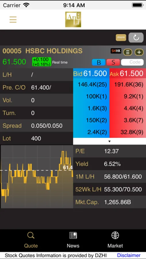 - 股價圖表,橫向手機即可顯示分析圖表,並可切換三種時段.