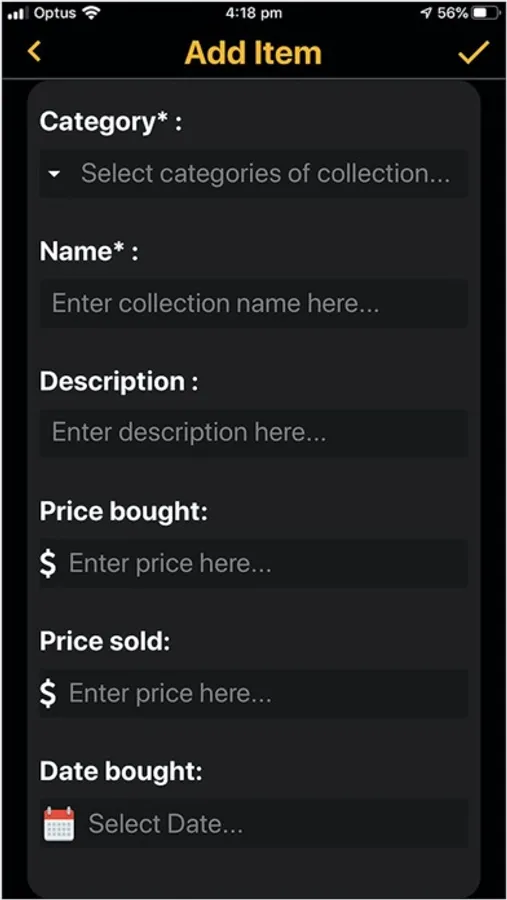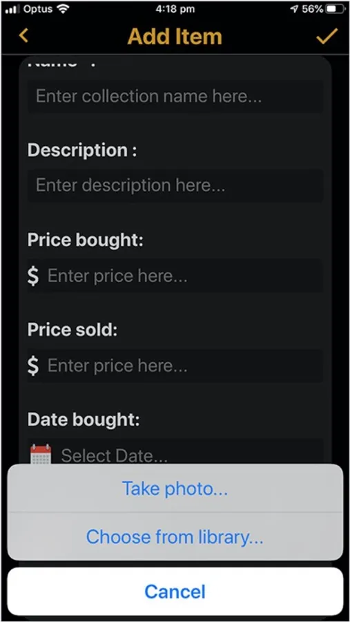 Add your items including Title, Description, Price & Date Bought, Price & Date Sold and add photo(s)