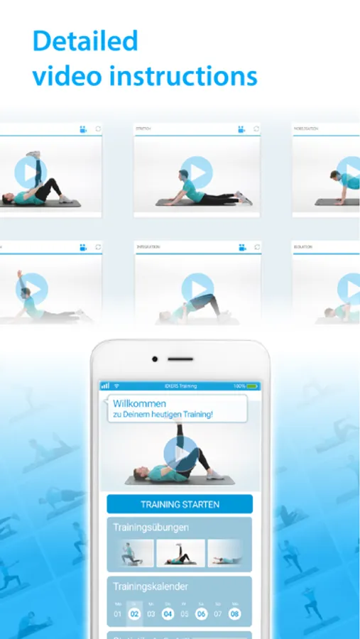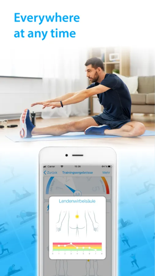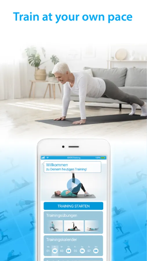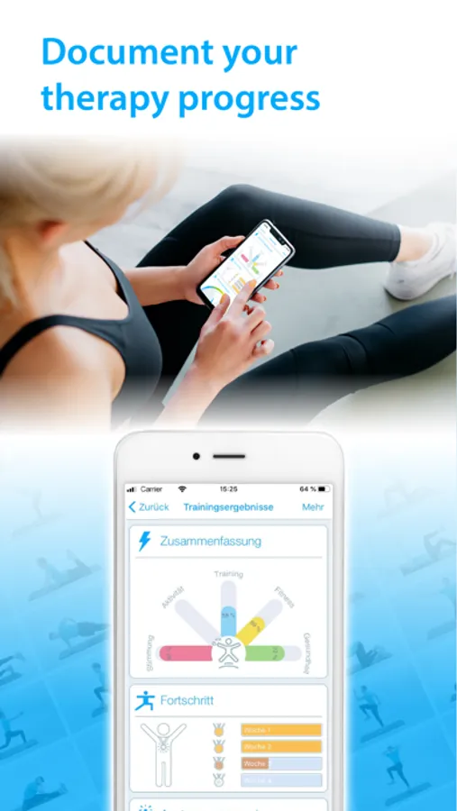 For your individual therapy, a pool of over 2000 different training exercises is used, which correspond to the latest training science findings and are explained in detail in video instructions to ensure correct execution. This way you always have your personal training with you. You can constantly work on alleviating your back problems and improving your health in order to lead a pain-free life. The training program consists of self-exercises for which no special aids are required. Additionally, by connecting to the Apple Health app, you can view your steps, traveled distance and number of traveled floors in the iDIERS app.