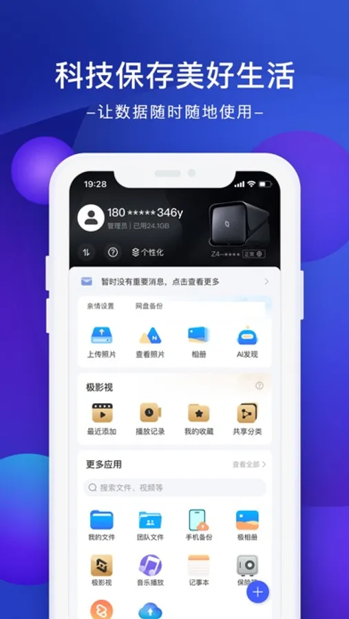 极空间产品可以帮你把手机、电脑、平板上的照片、视频和各种文件备份到你的私有硬盘上,防止个人数据丢失。
