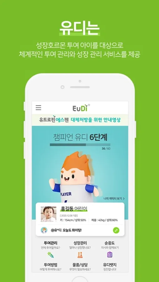 EuDi는 성장호르몬 투여 아이를 대상으로 올바른 성장호르몬의 사용정보 제공과 체계적인 투여관리 그리고 지속적인 성장관리 서비스를 제공하기 위한 어플리케이션입니다.