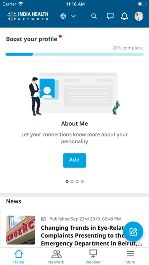 India Health Network is a Professional Networking Platform for Healthcare Professionals in India. A platform where you can connect to peers, follow KOLs, discuss medical cases, create public / private groups, earn CMEs, attend webinars and many more.