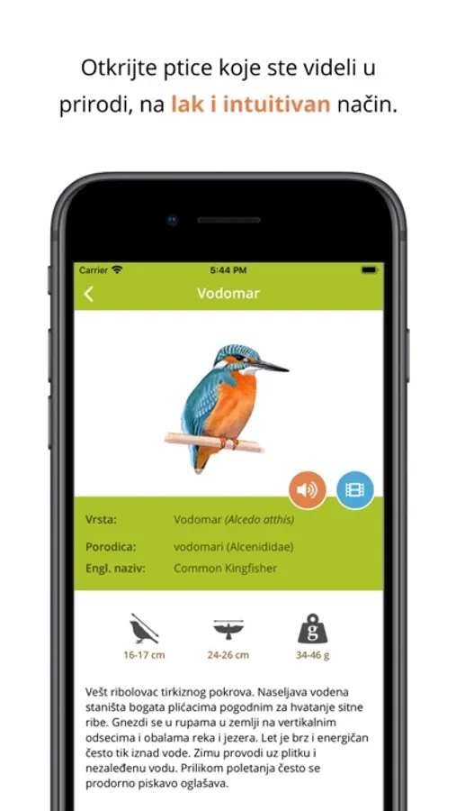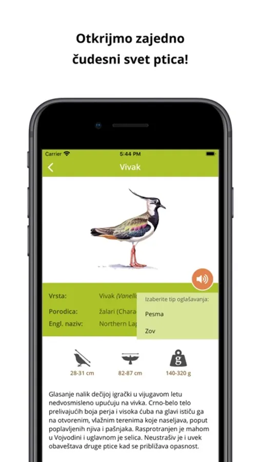 - Za neke vrste možete čuti i zvuke oglašavanja i gledati video snimke (NAPOMENA: za ove funkcionalnosti neophodna je Internet konekcija).
