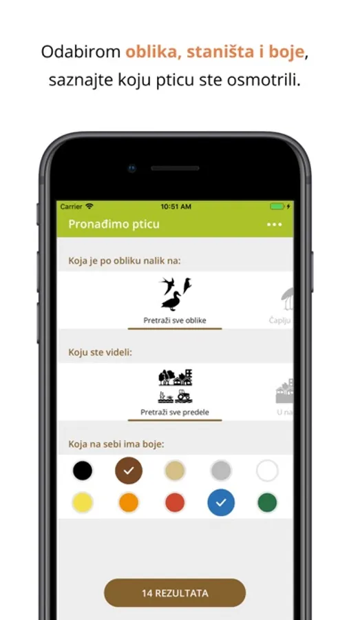 - Odabirom oblika, staništa i boja ptice, aplikacija vam sužava izbor na jednu ili više vrsta.