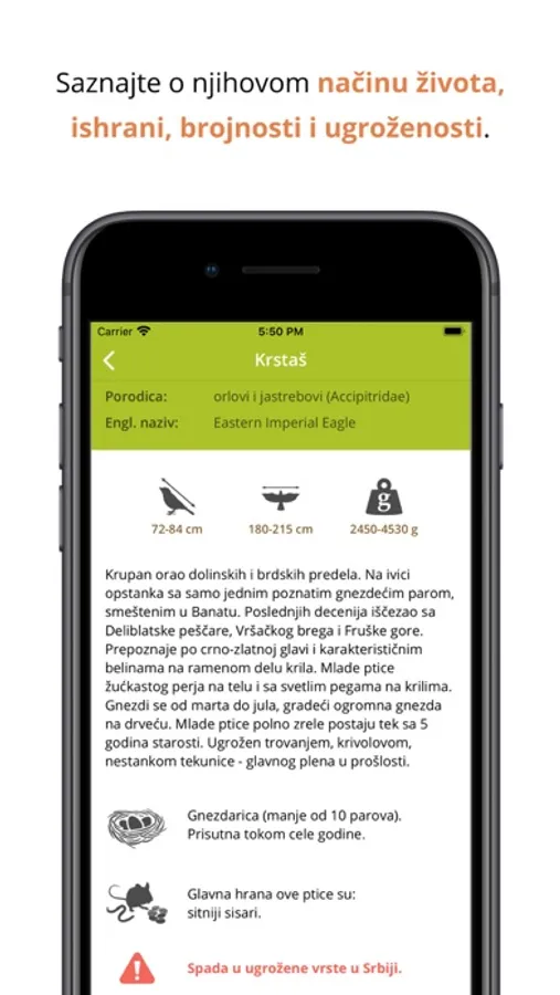 - Svaku vrstu ptice prate ilustracije, lična karta i kratak opis.