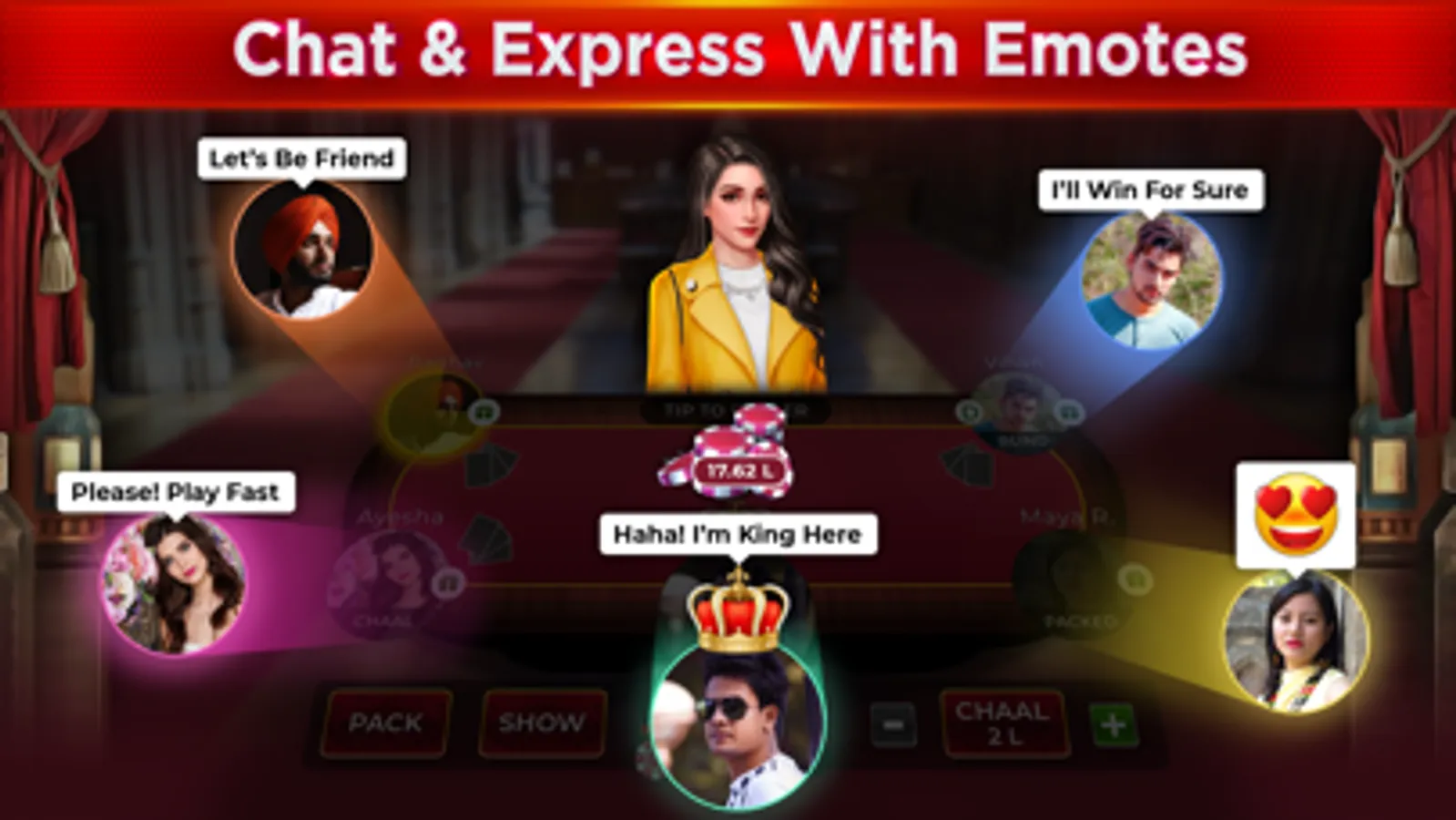 Play Royal Casino Teen Patti with millions of real users across the world. Feel the thrill of live casino at anywhere, anytime and with anyone! Download Royal Casino Teen Patti now and get tons of exciting rewards like chips and gems. Earn Many Free Chips for various tasks like daily logins and other awesome events.