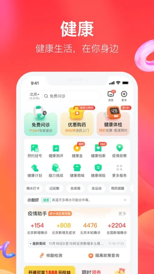 【线上就医】用户可以在首页、发现菜单中享受免费问医生服务,包括导诊接待、选择医生、医生诊断、康复管理。