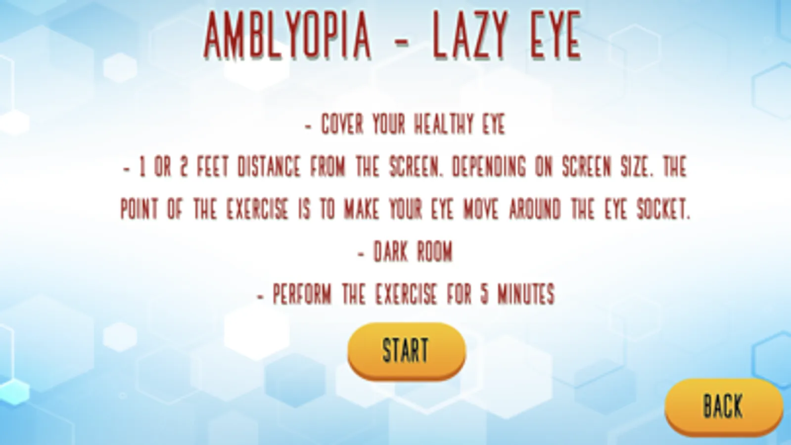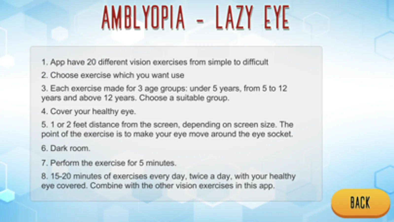 8. 15-20 minutes of exercises every day, twice a day, with your healthy eye covered. Combine with the other vision exercises in this app.