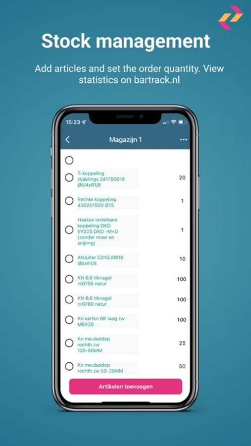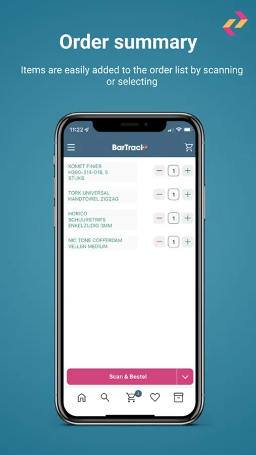 Keeping track of lists, calling in orders, searching through web shops. There is a lot involved in ordering articles and managing your stock. We thought there was room for improvement. That is why we developed BarTrack. Ordering is possible on BarTrack Online: search for articles by name or article code, select and order directly. But also via a free App: scan the barcode, check and order. Scan, click, done! BarTrack is also a complete VMI solution that allows you to set up stock locations, print barcodes yourself and thus order all your business products. With BarTrack, you order in one place from all your favorite wholesalers.