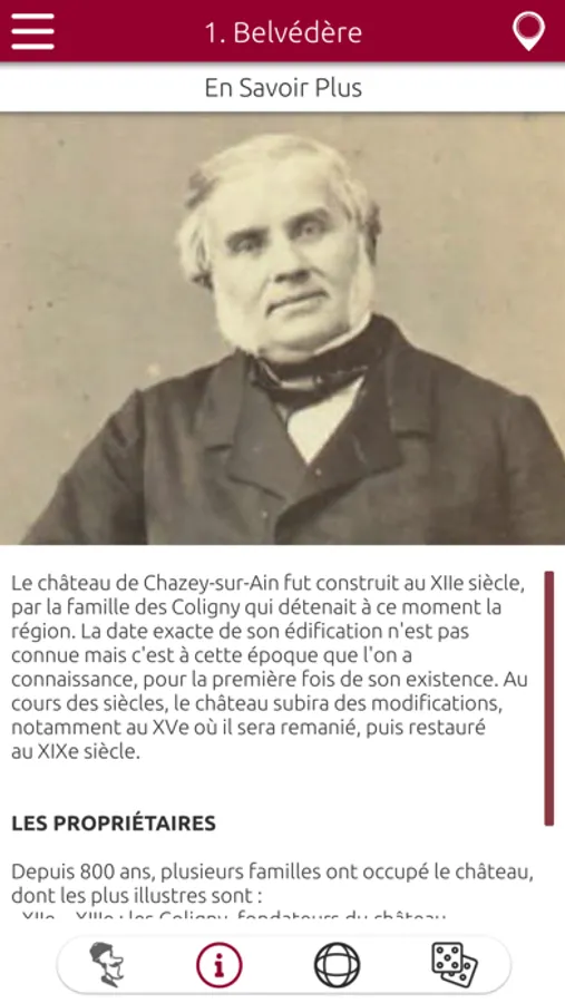 L’application propose une visite guidée augmentée avec pour guide le célèbre Jacques de Savoie, propriétaire du château au XVIème siècle. Au cours de votre parcours vous aurez accès à plusieurs types de contenu multimédia.