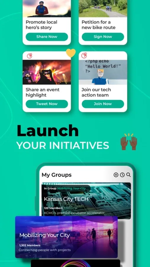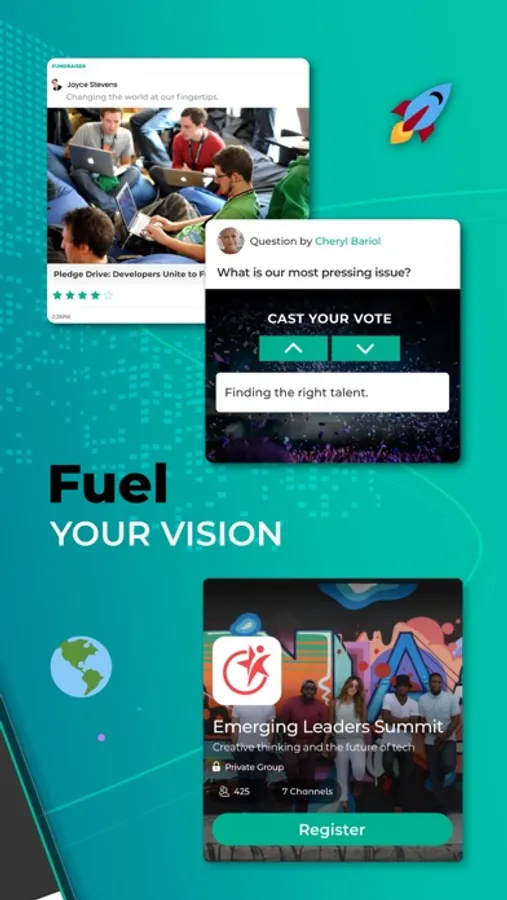Fuel your vision, find your people, launch your initiatives, mobilize your network, empower your events, protect your privacy and personalize your newsfeed.