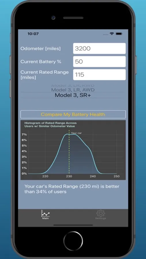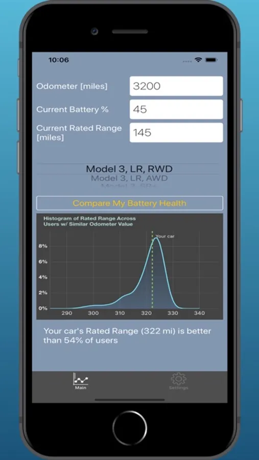 This app allows you to compare the battery capacity of your electric car with the battery capacity of other cars with the same configuration and mileage. In this way, you can determine if the battery capacity of your electric vehicle is better or worse than the majority of other cars with your milage and configuration.