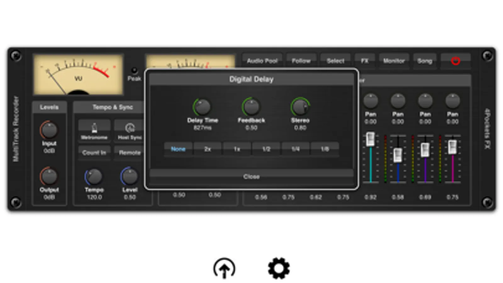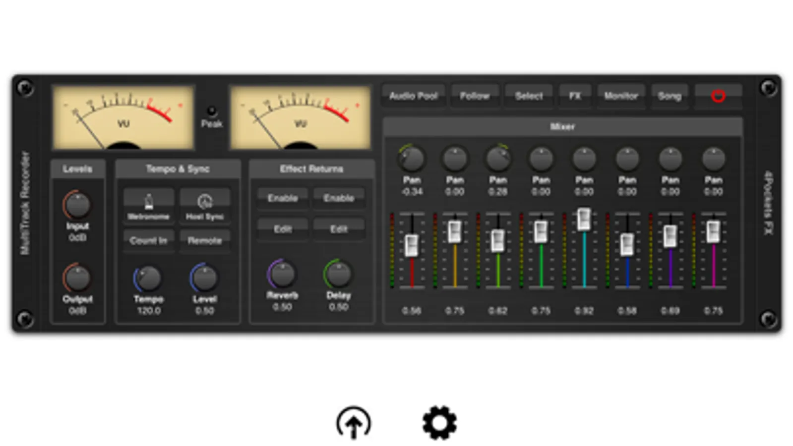 An intergrated 8 channel mixer allows you to control the level, pan and effect send levels. Although AUM allows some great routing options for third party effects, MultiTrack also includes an extremely CPU friendly beat synced delay and reverb which can be used where recording pre-effected instruments is not an option.