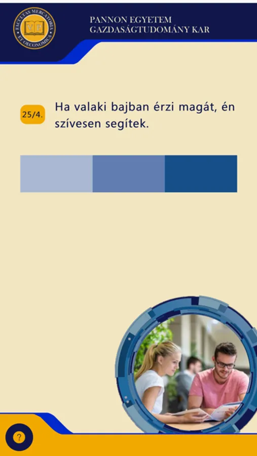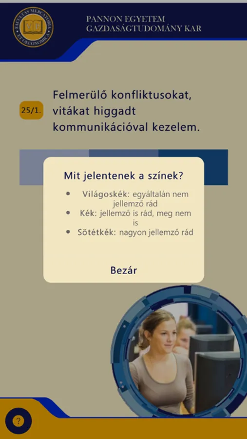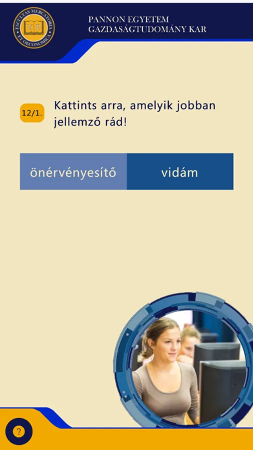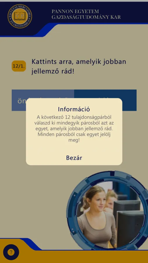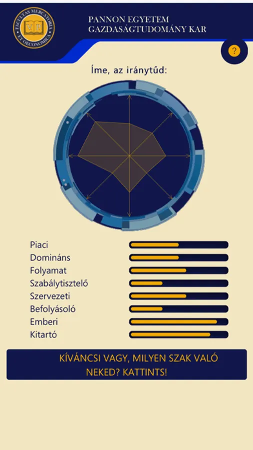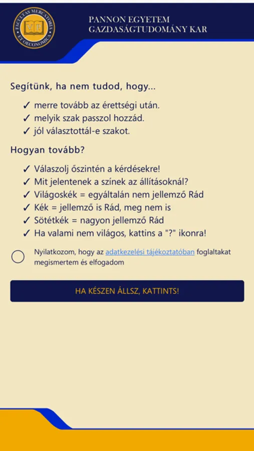 Az alkalmazás a Pannon Egyetem Gazdaságtudományi Karán (PE-GTK) induló szakokat hasonlítja össze a Te kompetenciáiddal, személyiségjegyeiddel, valamint ezen szakokról tájékozódhatsz az alkalmazás segítségével.