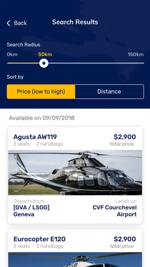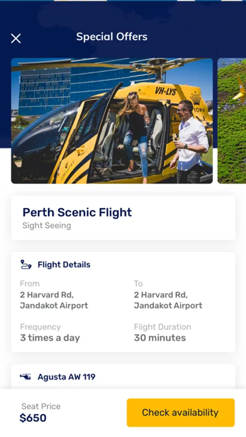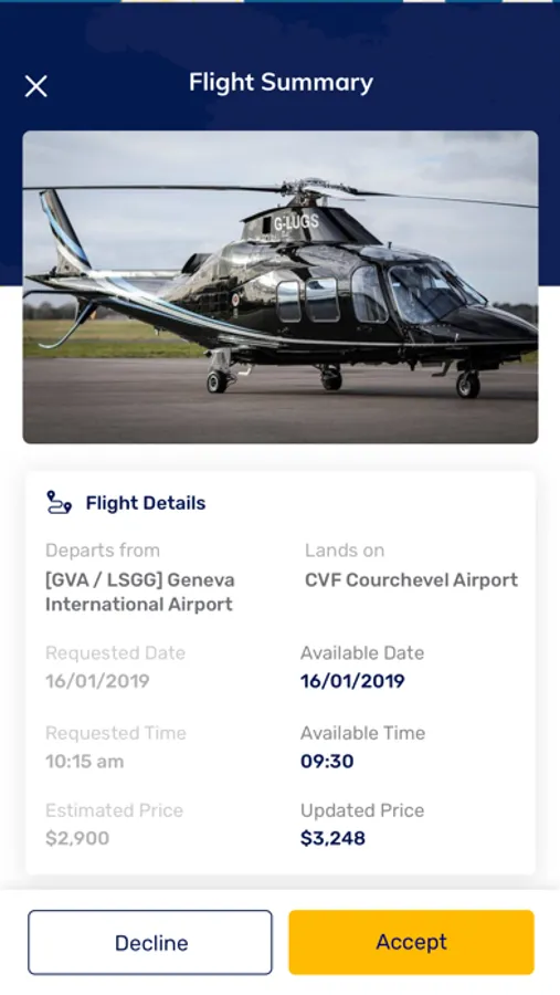 How to book a helicopter? To find and book a helicopter, you just need to define your departure and destination points, choose the date and time for your flight, select the number of passengers taking the flight, and submit the helicopter search. App will search for helicopters available nearby and list them sorted by the flight price.