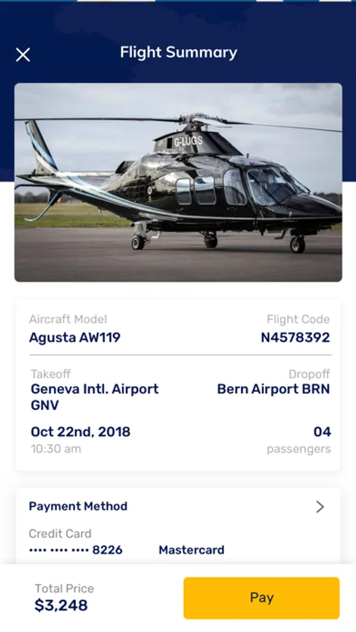 How do I pay for the flight? Once your flight is confirmed by the helicopter company, you can guarantee your booking with your credit card straight from the app, using secured payment processing.