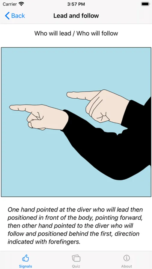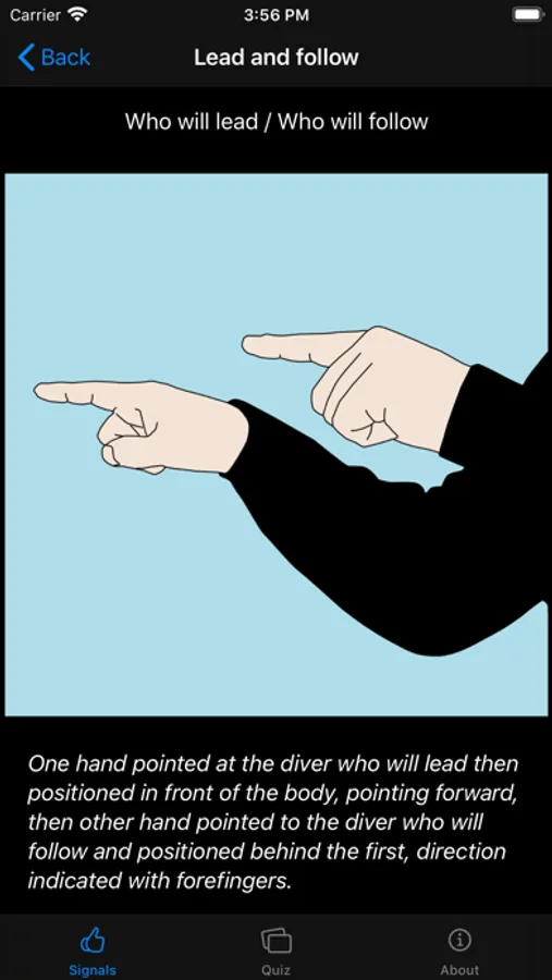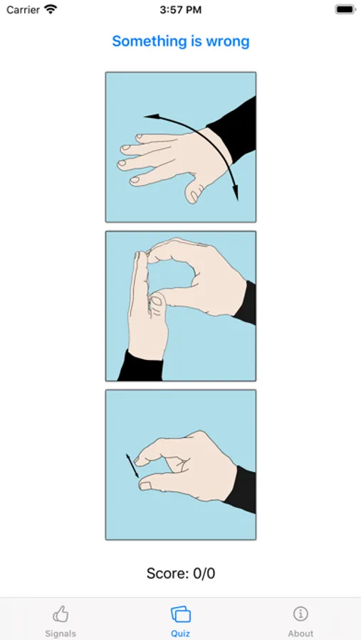 Once you've studied up, you can quiz yourself on what you've learned-- the app will show a series of five dive signal descriptions and give you a choice of three different pictures-- only one will match, so choose wisely!
