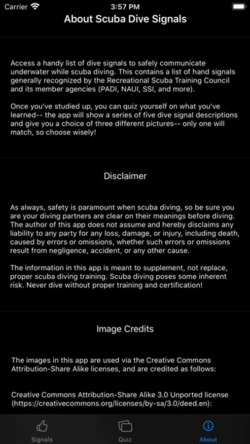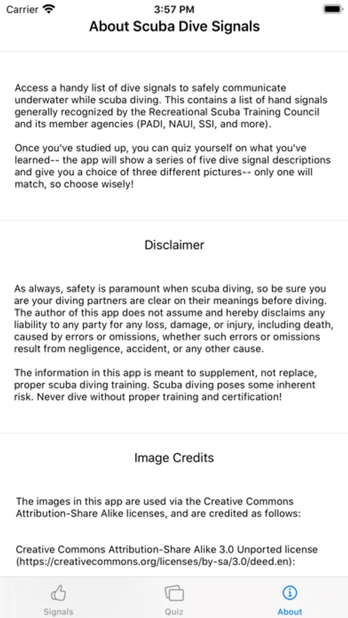 As always, safety is paramount when scuba diving, so be sure you are your diving partners are clear on their meanings before diving. The author of this app does not assume and hereby disclaims any liability to any party for any loss, damage, or injury, including death, caused by errors or omissions, whether such errors or omissions result from negligence, accident, or any other cause. The information in this app is meant to supplement, not replace, proper scuba diving training. Scuba diving poses some inherent risk. Never dive without proper training and certification!