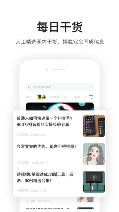 每日人工精选圈内干货文章,涵盖用户增长、私域流量、APP推广、ASO、新媒体运营、用户运营、数据分析、活动运营、职场进阶,无论思维升级还是实战技能,这里一站打包。