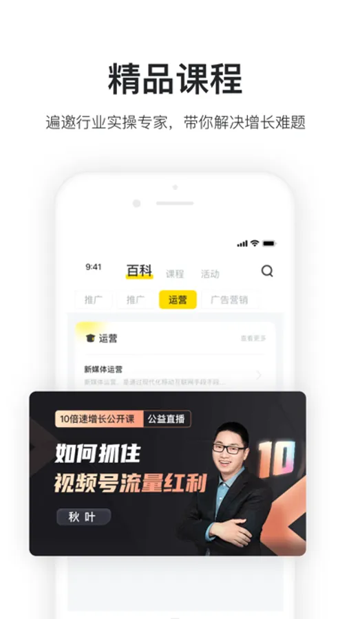 精选优质视频课程,APP营销推广、APP变现、抖音涨粉、用户运营、新媒体运营、活动运营全覆盖,遍邀行业实操专家亲自讲解,带你解决职场难题。