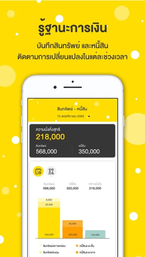 • บันทึกรายการสินทรัพย์และหนี้สินปัจจุบัน เพื่อให้รู้ฐานะการเงินว่าเป็นบวกหรือลบ สามารถอัปเดตข้อมูลทั้งแบบรายเดือน และรายปี