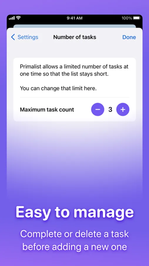 - Control how many tasks you want to have at one time (from just one up to seven)