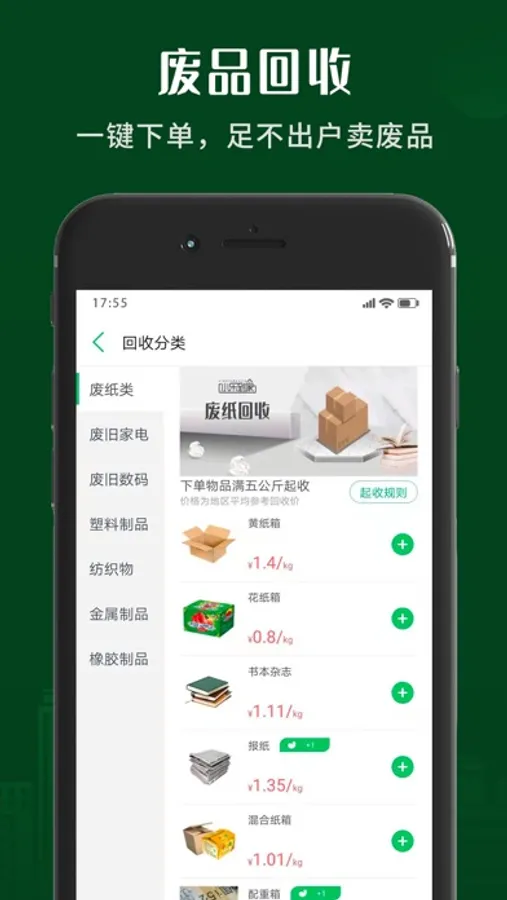 在线下单,提交废品信息,回收员快速上门,明码标价、方便快捷,动动手指足不出户就可卖废品。