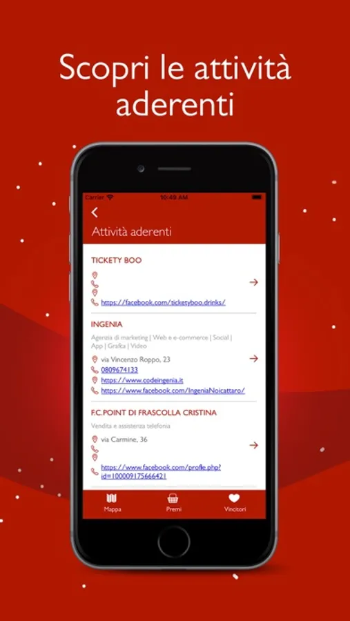 All'interno dell'app troverai una mappa contenente tutte le attività aderenti al concorso ed una lista con i recapiti di tali attività.
