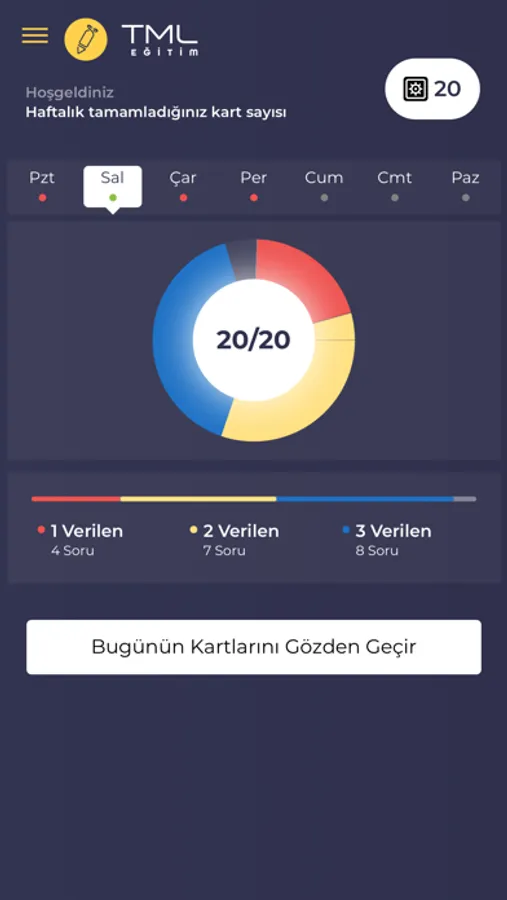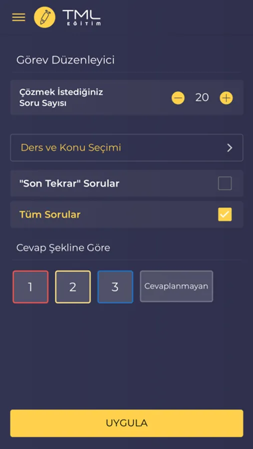 TML uygulamasıyla günlük görevini yalnızca çalıştığın dersin ilgili konusu olarak veya bir kaç ders olarak veya tüm dersleri kapsayacak şekilde seçebilirsin. Uygulama ana sayfaya yalnızca tekrar etmek istediğin derslerin/konuların içeriklerini çıkartır.