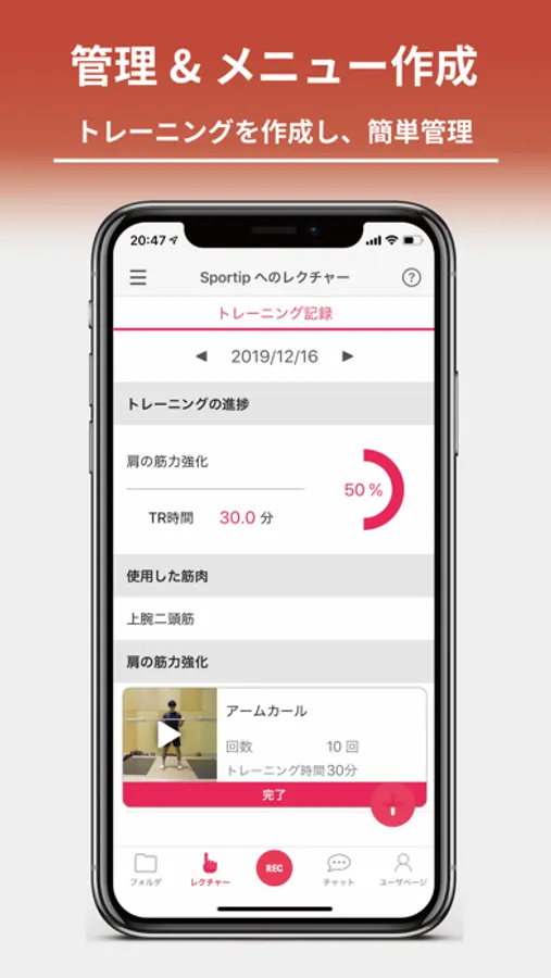 いつ何のトレーニングをどのくらい行えば良いか簡単に確認することが可能!トレーナーの指示通りトレーニングを記録できます。