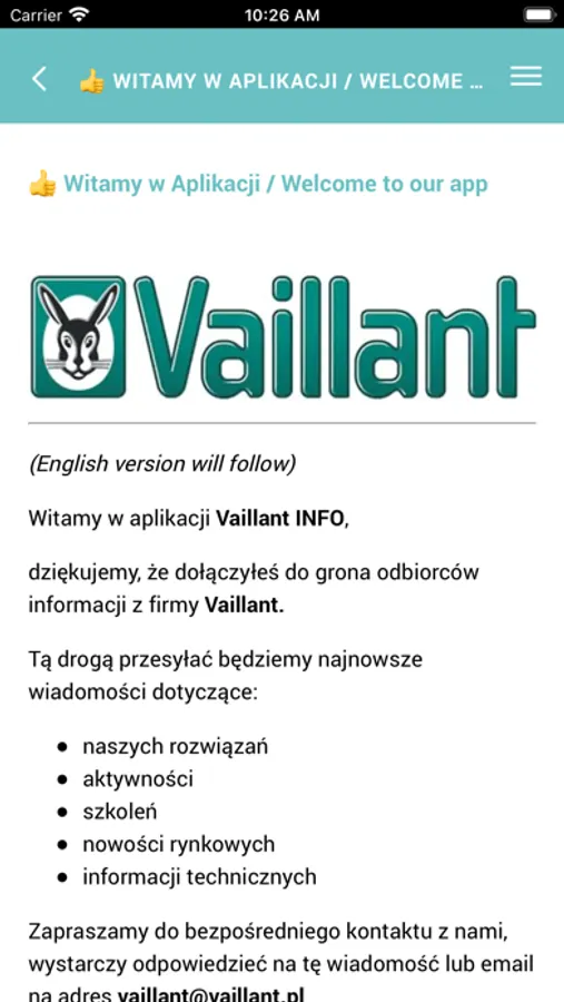 Aplikacja komunikacji z VPSCelem aplikacji jest sprawne przekazywanie partnerom marki Vaillant najważniejszych informacji z zakresu działań marketingowych, sprzedażowych oraz serwisowych z najbliższego okresu działalności marki. Aplikacja ma również być zbiorem najważniejszych informacji dla podmiotów związanych z marką.