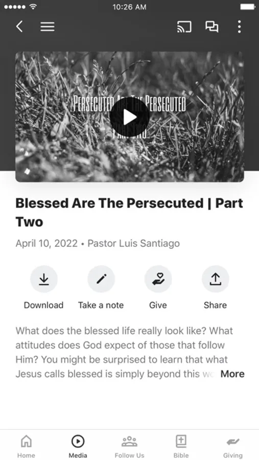 This app will help you stay connected with the day-to-day life of our church. With this app you can: watch or listen to past messages; stay up to date with push notifications; share your favorite messages via Twitter, Facebook, or email; and download messages for offline listening.