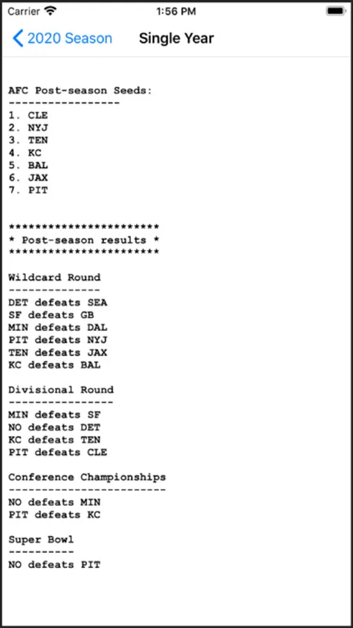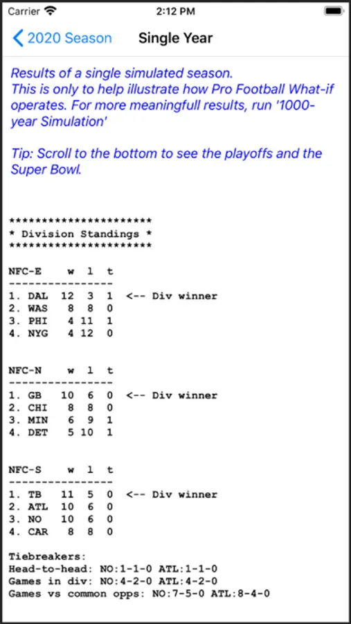 It starts with the current standings, and then simulates the remaining schedule 1000 times using random numbers combined with power ratings, and then it aggregates the results. It's got all the tie breakers programmed in, like head-to-head, games in division & conference, common opponents, and so on. The current season actual results are updated on the Web by 10A.M. following every game day, and automatically downloaded to your phone when you start the app.