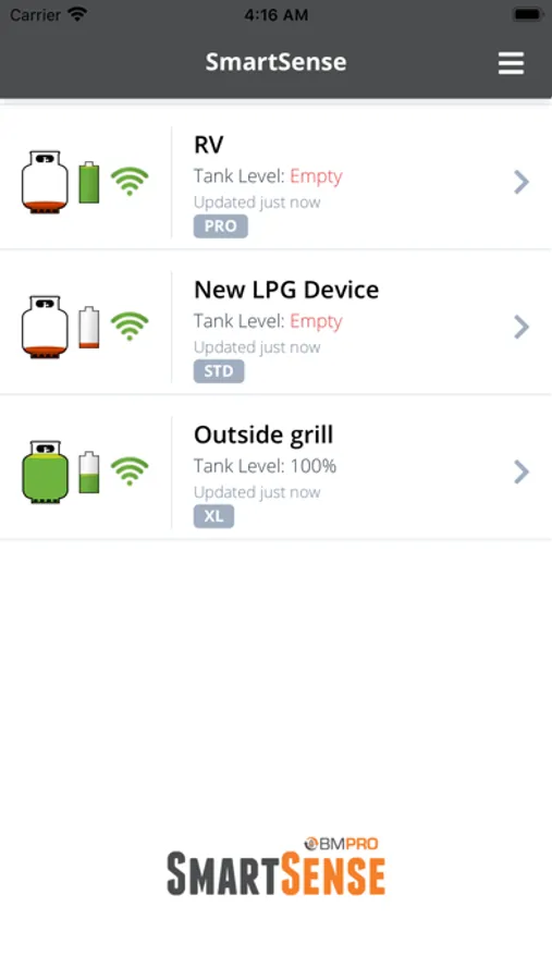 This application is designed to be used with the BMPRO SmartSense sensor. The application can measure the LPG propane level to tell you the exact fill level and when your tank is empty. It can be used on tanks found in RVs, heaters, BBQ grills, etc. The SmartSense sensors are magnetically stuck to the bottom of your propane tank and will periodically measure and wirelessly send the fill level or percentage to the Tank Check app. Stick it on the bottom of your tank and know exactly when you are running low on propane! This technology is patent pending.