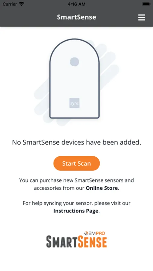 1. To pair your SmartSense sensor to the phone, simply press the "Sync" button on the back of the sensor while the app's main screen is visible. The first time you use your SmartSense sensor you must press the "Sync" button 5 times in a row in order to wake up the sensor.