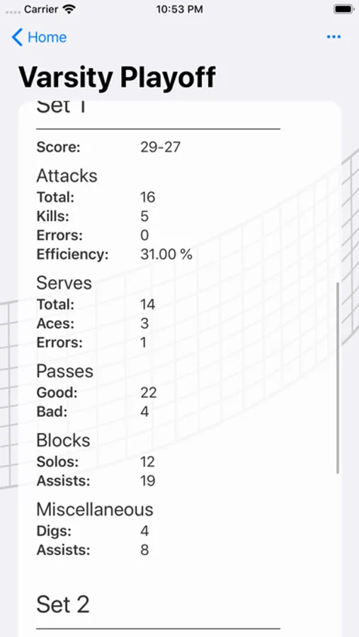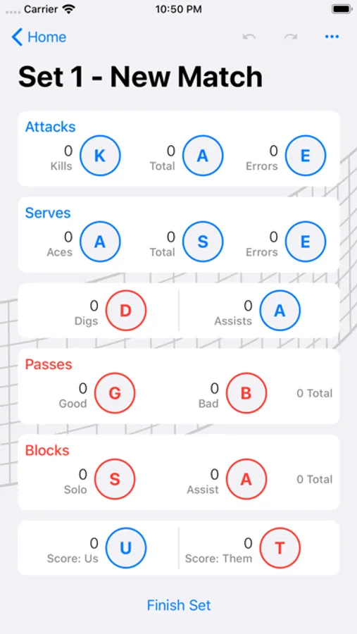 VolleyStats is a simple tool that helps track stats for a player during a match. When your player makes any attack, serve, pass, or block, just push the button that corresponds to that move, and VolleyStats will keep track of the totals.