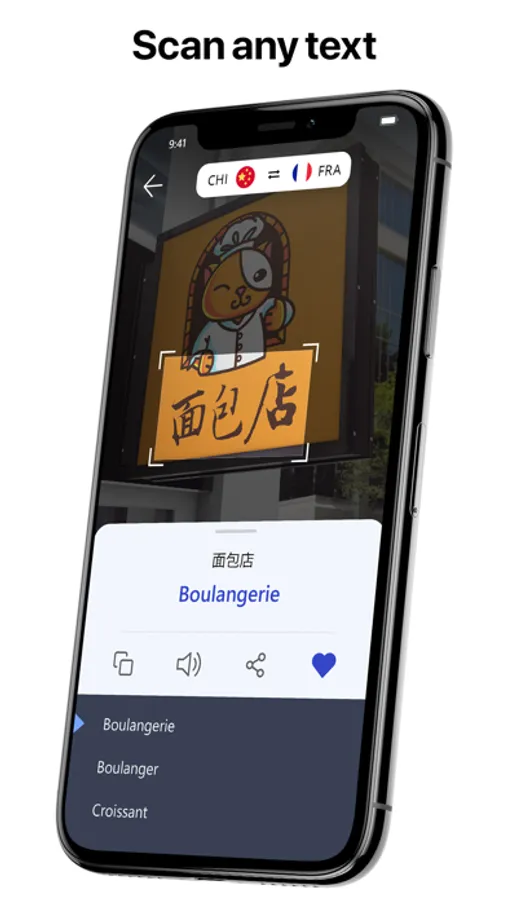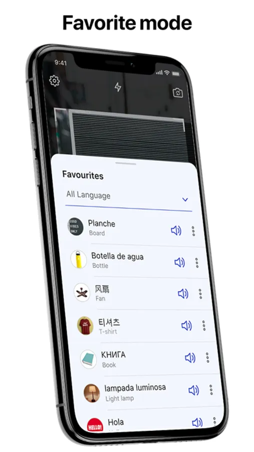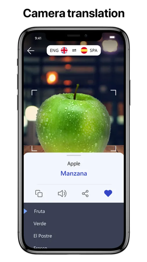 You can copy your text or object translation, share it on any platform, save your favourite words and listen to pronunciation.