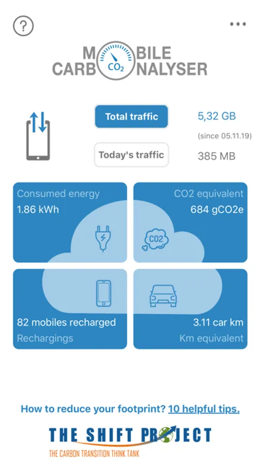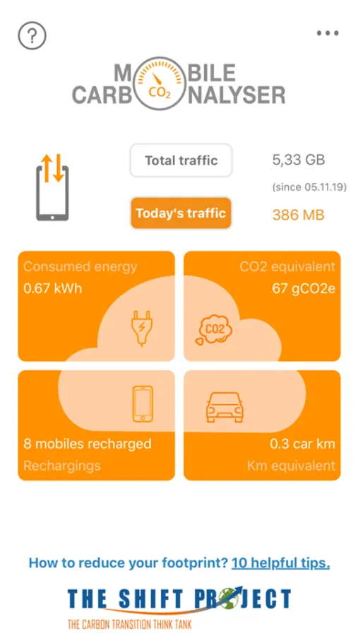 This application allows you to view the electric power consumption related to the use of your smartphone. This consumption is essentially based on the amount of data exchanged (Internet browsing, viewing videos ...) by the different applications that you use on your mobile. From this electricity consumption is estimated the greenhouse gas (GHG) impact in grams of CO2, in equivalent number of recharged mobiles and in km equivalent of car.