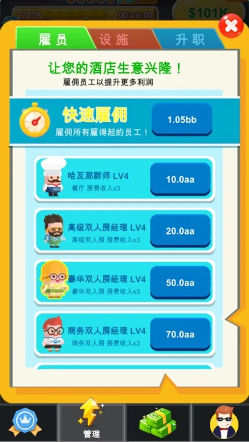 从最普通的标间,大床房,经营到行政套房,总统套房;从仅有客服服务到增添酒吧健身房,吸引更多的顾客,满足不同人群的需求。不断升级和改进,成为最有成就的酒店大亨。