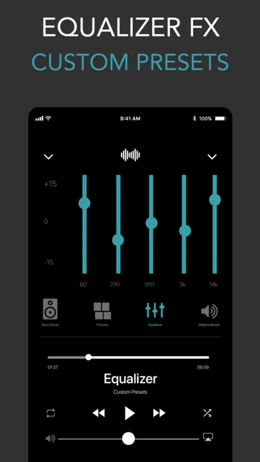 + All-in-one Music Player: Bass Booster, Volume Amplifier, Manual Equalizer, Custom Presets, Shuffle features, Easy Navigation