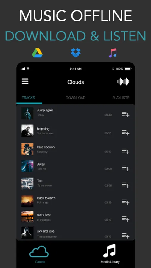 + Get Music from your library or from the Cloud (Dropbox, Google Drive)