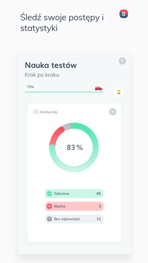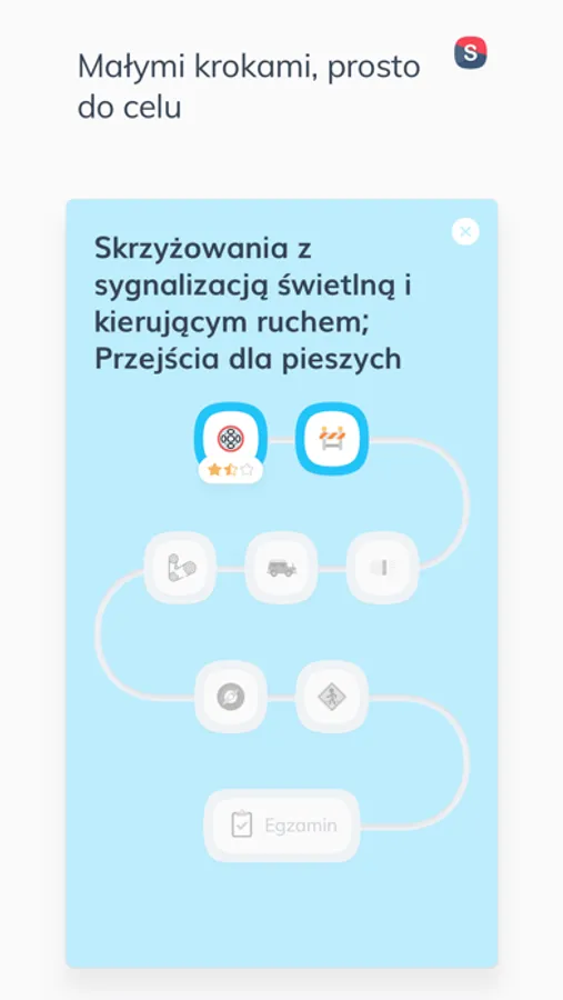 In the "Training - Step by Step" mode, each stage has been divided into small levels that require passing in order to move on. Additionally, each stage is finished with a separate test. Thanks to this method of learning, it is much easier to acquire knowledge and be sure to pass the state exam.