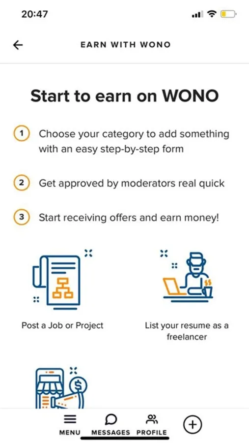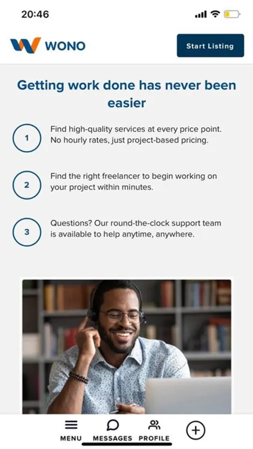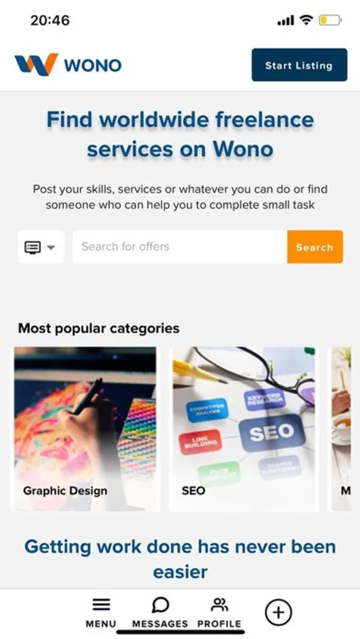 We offer a hub for users to post jobs to be completed by a freelancer or those looking to work. Wono users can post different types of projects on the platform, find jobs or freelance projects and services.