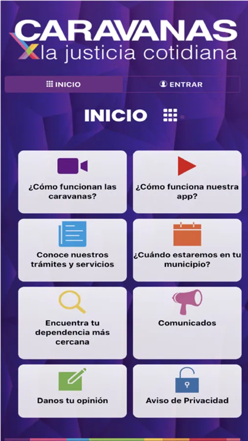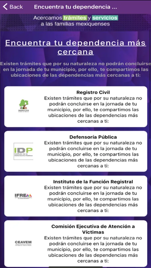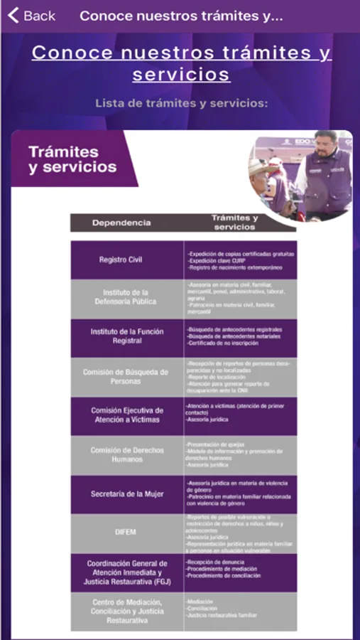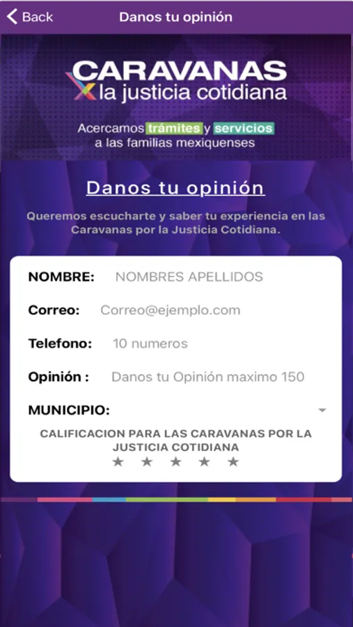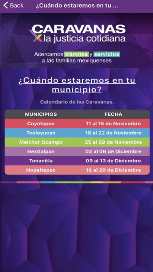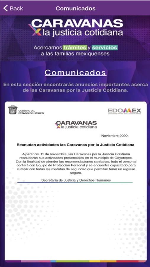 La Aplicación permite que la información generada en cada uno de los módulos de las dependencias que participan en las Caravanas por la Justicia Cotidiana sea consultada a través de un código QR que se encuentra ligado a la persona usuaria.