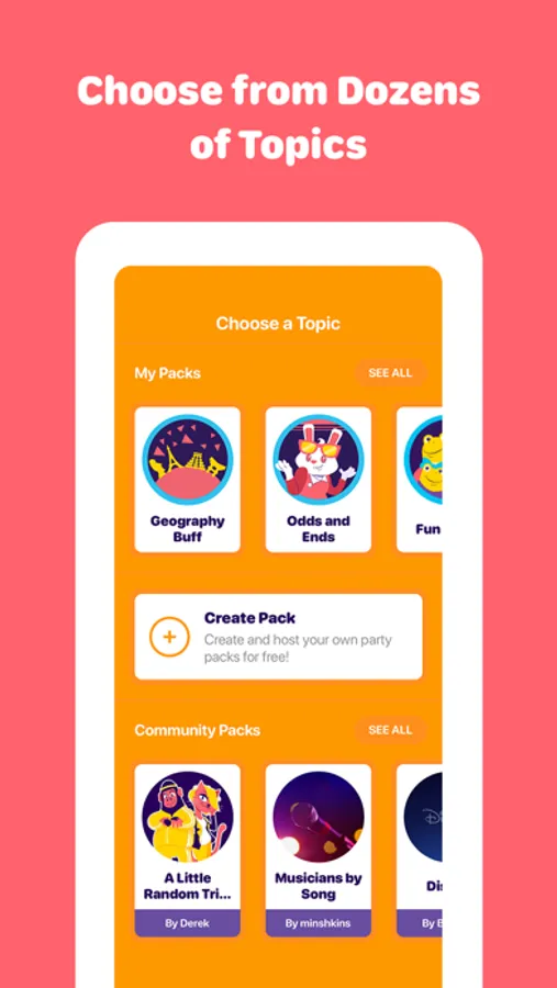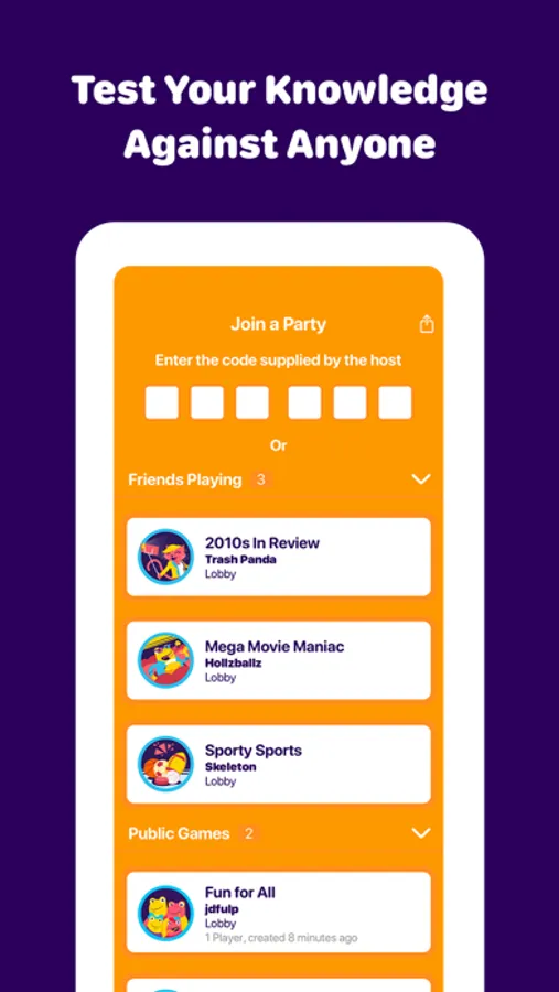 From Sporcle, the world's largest trivia company, comes Sporcle Party. Challenge friends to topics from movies, geography, sports, science, literature, history and so much more. OR make your own pack. Perfect for office parties, classroom fun, baby showers and playing with friends - in person or virtually.